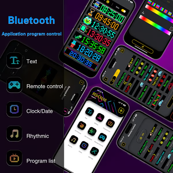 LED-displayen styrs via en app som kopplas via Bluetooth och stödjer flera LED-displayer samtidigt, vilket gör ditt fordon eller din butik mer iögonfallande. Appen innehåller många roliga lägen och animationer. Du kan enkelt anpassa mallar och roliga texter via mobilen för att ge din bil eller butik en personlig touch.