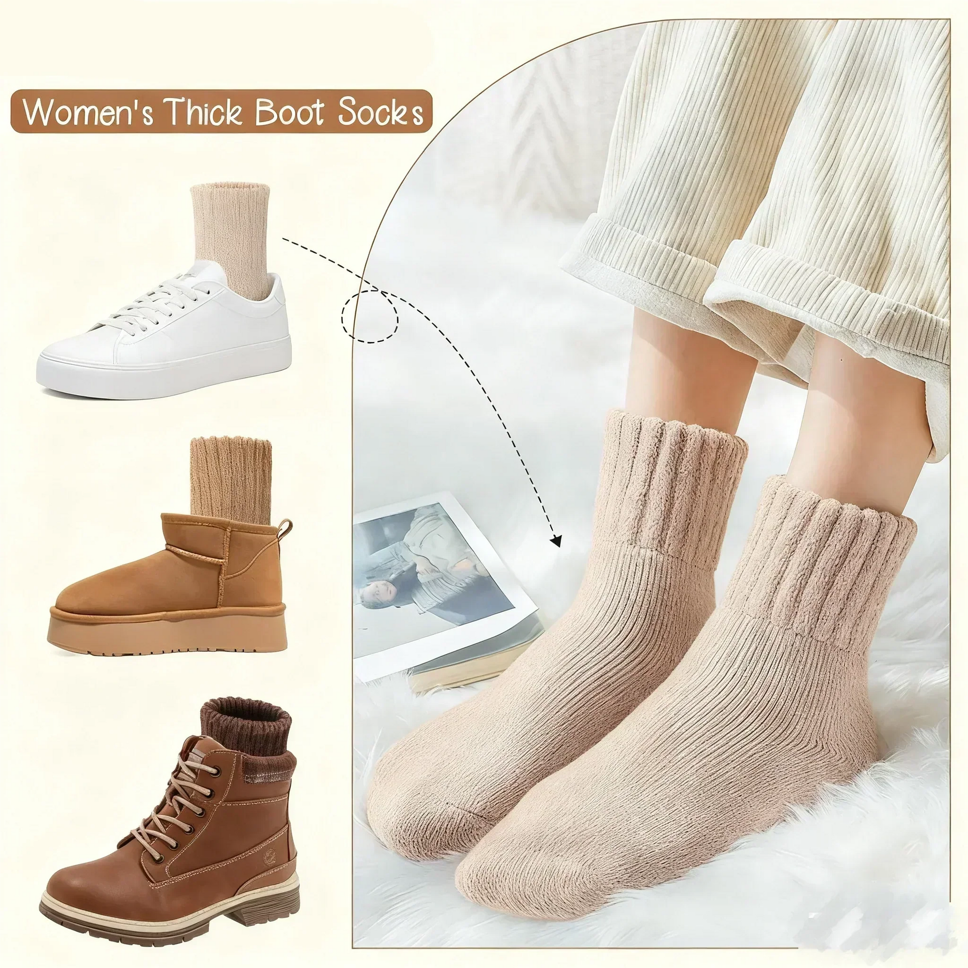 Tjocka vinterÂsockor med midjonslĂ€ngd, lĂ€tt högre Ă€n ankeln â passar perfekt med stövlar, slides och tofflor. Visar trendig stil samtidigt som de effektivt förhindrar kalla vindar och vĂ„rdar dina fötter.